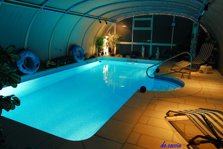 Dusche, Liegen sowie Sport- und Spielgeräte sind vorhanden und Freiterrasse. Im Dunkeln kann das Schwimmbad über und unter Wasser beleuchtet werden - eine einzigartig romantische Stimmung werden Sie erleben.