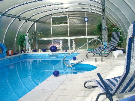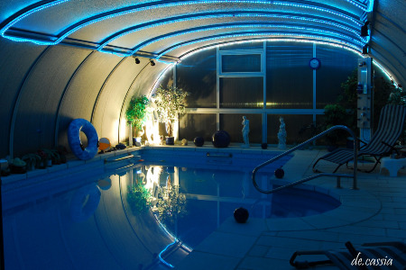 Sie können das 50 qm überdachte Schwimmbad nutzen mit 28 qm Pool (Inhalt 34 cubm), incl. zweistrahliger starker Gegenstromanlage mit Bodendüse - beides mit Luftsprudel.