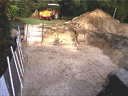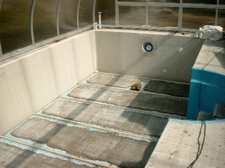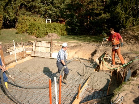 Die Räume zwischen Außenwand und Becken wurden mit Aushubsand aufgefüllt. Auf die so entstandenen Sandflächen kamen abschließend 50 mm Styroporplatten als Wärmedämmung unter die Betonhohldielen. Deren gespeicherte Wärme wirkt dann der nächlichen Auskühlung entgegen.