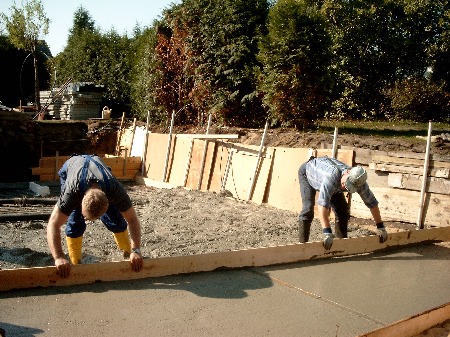 Das Abziehen war nicht so gut gelungen und erforderte späteres Nachglätten. Boden-ablauf und Bodensprudel wurden ausgespart (Styroporfüllung). Auch die Treppe erhielt eine Grundplatte - sicher ist sicher. Schließlich soll ihre Hintermauerung festen Stand haben.