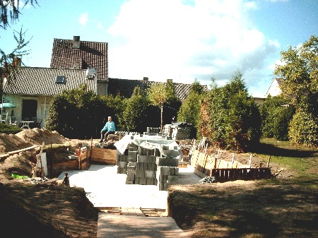 Nachdem die Bodenplatte hinreichend abgebunden hatte, wurden die Betonsteine bereit gestellt - schön 50 m von der Straße hereingekarrt, wie alles, was hier verbaut werden musste. Das hat "großes Vergnügen" bereitet - .