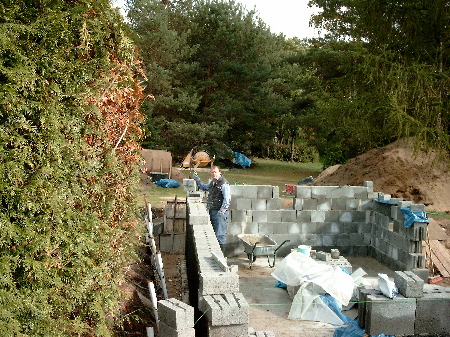 Gemauert wurde mit Hohlbetonsteinen. Korrektes Fluchten, Winkeln und Nivellieren ist unabdingbar, aber nicht einfach - das weiß, wer es probiert hat.