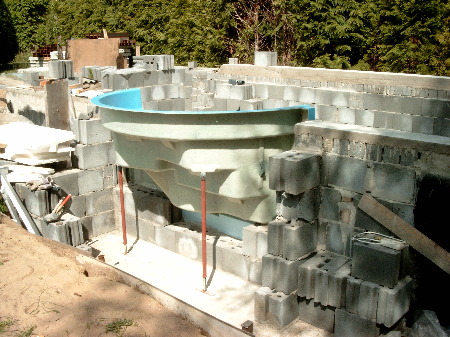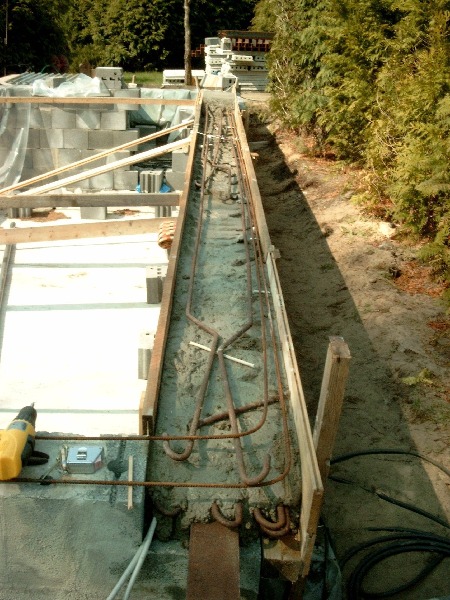 Fast alle Wände hatten funktionell Außen-Stützen - die Treppenseite und die Skimmerseite durch die rechtwinkligen Anmauerungen für die Treppe bzw. die Filter-Technikgrube, die Seite der Gegenstomanlage durch die Gründung für den erfoder-lichen Außenschacht. Nur die zweite Längsseite erhielt zur Stabilisierung oben einen Teilringanker. Darauf würde ich bei Mauerwerk von der Länge nicht verzichen wollen. Zu viel ist hier besser als zu wenig, meine ich.