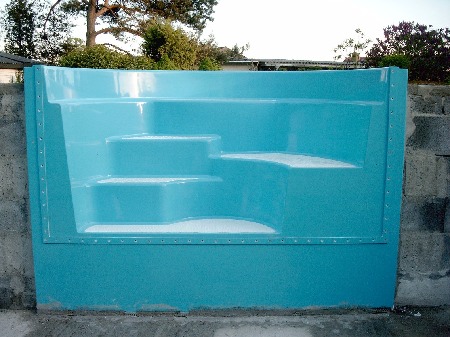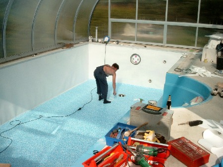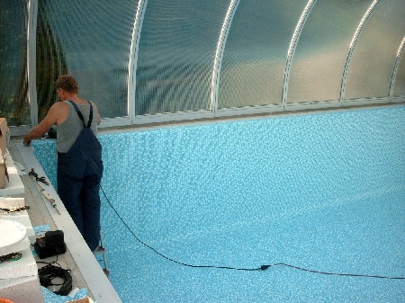 Die Folie wurde auf den Spezial-Blechen - wie auch auf ihren Überlappungen -mittels Heißluft verschweißt. Nähte wurden zusätzlich abgedichtet. Das gewählte Foliendesign (Wände Mosaik, Boden Natursteinchen) in frischestem Blau sieht gut aus und ist auch identisch mit dem Blau der Treppe. Großes Lob für den absoluten Folienexperten!!! Nicht eine Falte war zu sehen. Alles einwandfrei! Ein herrlicher Anblick! Und so blieb es auch bis jetzt.