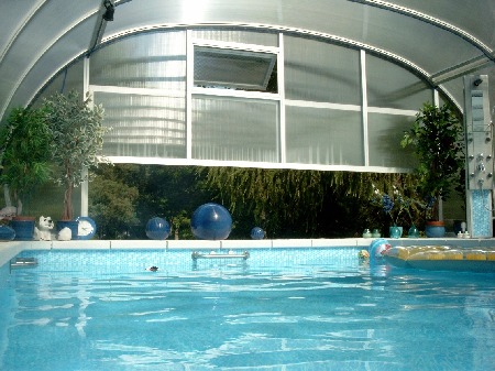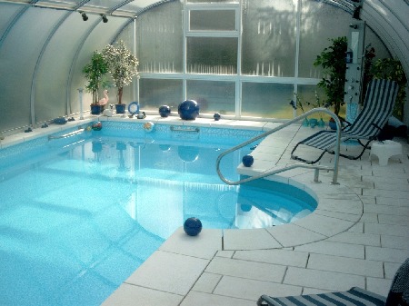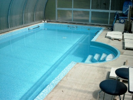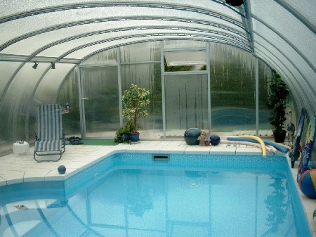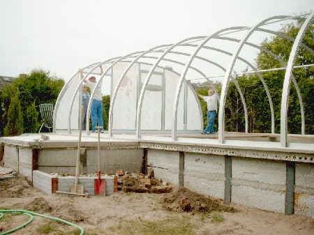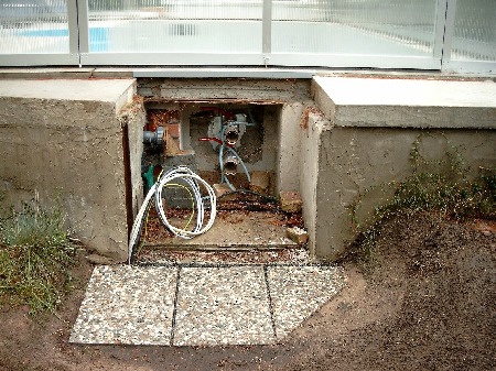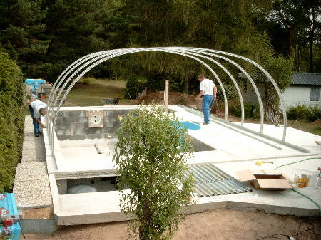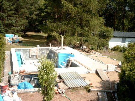 Endlich konnte die Überdachung montiert werden. Sie schützte zugleich den weiteren Innnenausbau, was ganz wesentlich war. Im Vordergrund links ist der Schacht für die Filter-Technik zu sehen - rechts daneben die Überdachung der Boilergrube für den hauseigenen Brunnen. Dieser wird aber nur für die Grundstücksbewässerung genutzt und nicht für den Pool, da eisenhaltiges Wasser bei Chlordesinfektion die Poolinnenflächen mit einem bräunlichen (Rost-)Film überziehen würde.Der Pool wird nur mit Frischwasser aus dem zentralen Netz betrieben.
