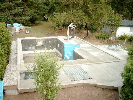 Die nachfolgende Darstellung schildert für Interessenten, wie ich unseren Pool als Eigenprojekt gebaut habe. Es zeigt anhand von Fotos die wesentlichen Bauab-schnitte. Achtung ! Das ist keine Bauanleitung oder Nachahme-Empfehlung !!!!! Jeder Eigenbauer sollte sich zuvor reiflich überlegen, ob und was er selber kann, oder was besser nur Fachleute können und ausführen sollten. Jeder Baufehler rächt sich früher oder später. Da ich unter anderem auch vom Baufach und überhaupt handwerklich bin, habe ich es mir zugetraut und mit Hilfe der Familie und Freunde (großen Dank an die Helfer!!!) zustande gebracht.