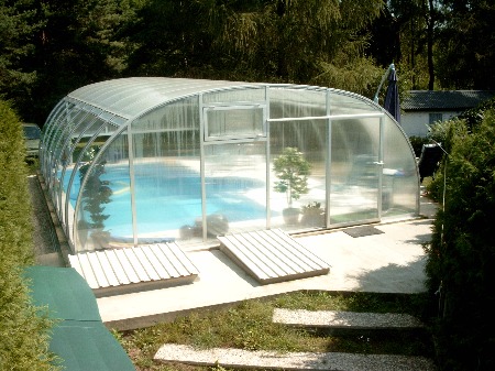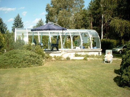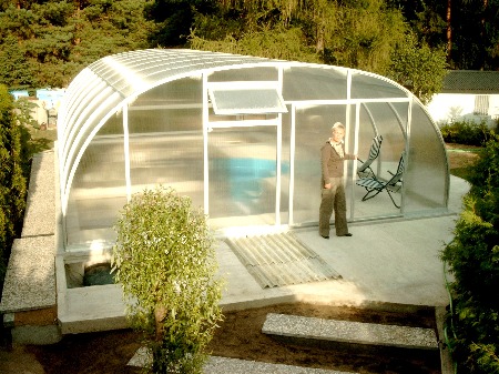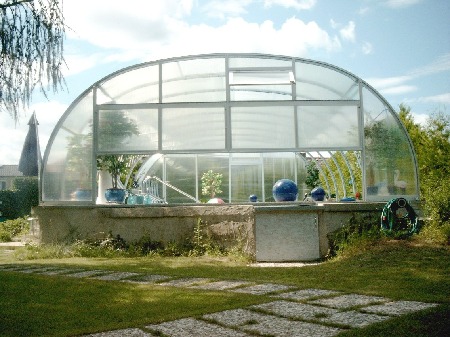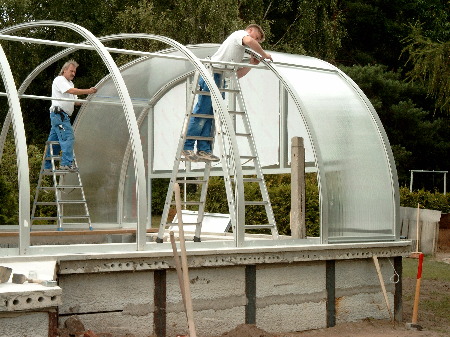 Die Alu-Konstruktion der Überdachung ist perfekt. Sie versteift die Bögen total stabil mit nur 2 Streben. Alle Einzelfächer lassen sich voll aufschieben. Als Zusatz wurden hinten unten zwei Klappen je 1 x 2 m eingebaut, die getrennt zu öffnen sind und zusätzlich schönen Ausblick erlauben. Die Giebelseiten enthalten oben Lüftungsklappen 0,50 x 1 m, was für regulierte Belüftung sehr vorteilhaft ist (auch über Nacht, wenn man bei übermäßiger Hitzewelle kühlen will !).