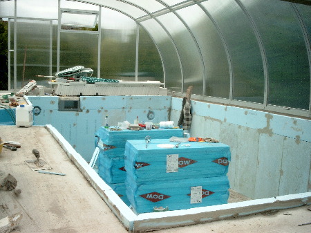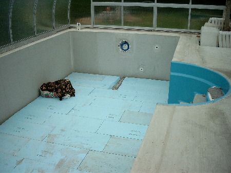 Jetzt ging der Innenausbau weiter. Es wurde innen wärmegedämmt, was eigentlich nicht empfohlen wird. Ich aber wollte einen vorgezogenen Beginn der Bade-Saison dadurch erreichen, dass das Wasser sich durch Treibhauseffekt möglichst schnell erwärmt, ohne den ganzen Baukörper erwärmen zu müssen. Auf die nachhaltige Wirkung der Baukörper-Erwärmung kann ich verzichten, weil der Treib- hauseffekt am Tage und die geringe Auskühlung nachts zumeist ausreichen, auch niedrigere Temperaturzeiten hinlänglich zu überbrücken. Ich verwendete 50 mm Styro-dur in der benötigten Festigkeit. Das Ganze ist sehr kosten- und arbeitsaufwendig und schafft auch Probleme der Bündigkeit und Stabilität an den Einbauteilen und der Treppe. Die Teile müssen entsprechend herausragend eingebaut und dann zu den Dämmplatten plan eingespachtelt werden. An den Wänden sollen die Platten voll an-liegen, was kaum zu erreichen ist. Ich habe sie nach Glättung der Wände angeklebt und zusätzlich noch versenkt verschraubt, was eigentlich auch nicht sein soll. Sie wurden dann auf der Fläche gewebearmiert verspachtelt - auch um die Beckenkante. Die Innendämmung ist bei Mauerwerk problematisch (Taupunkt, Kondenswasser, Himterfeuchtung). Was die Dauernutzung dieser Variante bringt, wird sich zeigen.