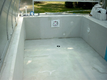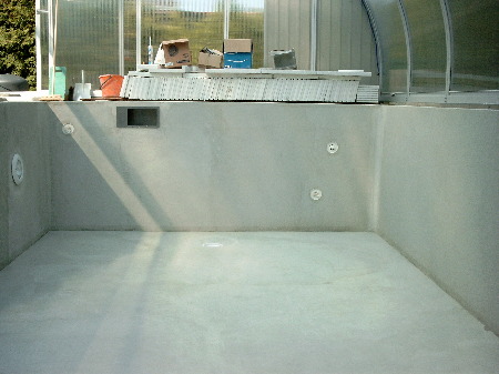 Wichtig war die Glättung der Wände. Vor allem aber der Boden muss glatt sein !!! Das Spachteln hat viel Arbeit gemacht, doch die Wohltat für die Fußsohlen beim störungs-freien Laufen dankt es einem - außerdem zeigt sonst im Dunkeln das Licht der Unterwasserscheinwerfer jede Unebenheit unschön.