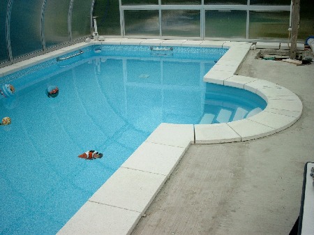 Die Beckenrandsteine gaben dem Pool jetzt den gebührenden Rahmen. Es kamen nur "Nasensteine" in Frage wegen der besseren Ansicht. Man sieht unter ihnen keine Fugenkante zum Becken hin. Verlegung erfolgte mit Gefälle zum Becken. Deshalb mussten die schönen Innen-Ecksteine leider mittig durchtrennt werden. Vor Verlegung mit einem Super-Flex-Kleber erfolgte Zweifach-Imprägnierung auf den Platten oben und Haftbrücke unten - letztere auch auf dem Beton. Diese Verfahrensweise ist aufwendig, bringt aber Sicherheit.