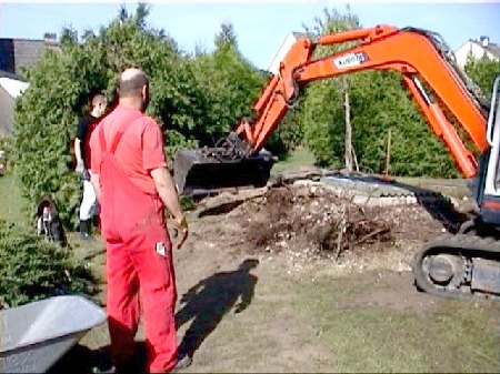 Beim aufwendigen Ausbaggern wäre es ohne Technik und Helfer nicht gegangen. Zuvor: Gelände abgesteckt und benötigte Höhen bzw. Tiefen markiert.